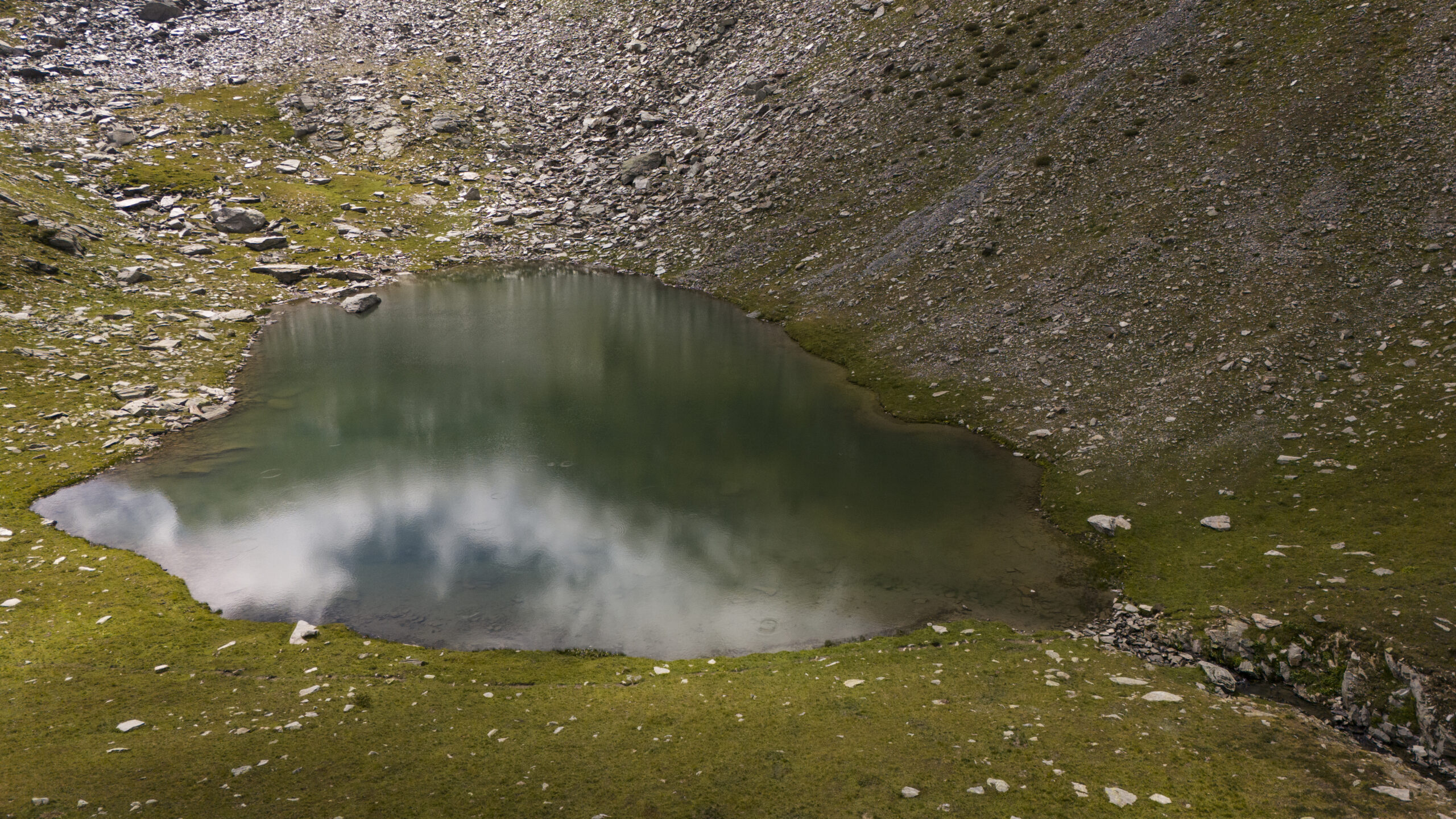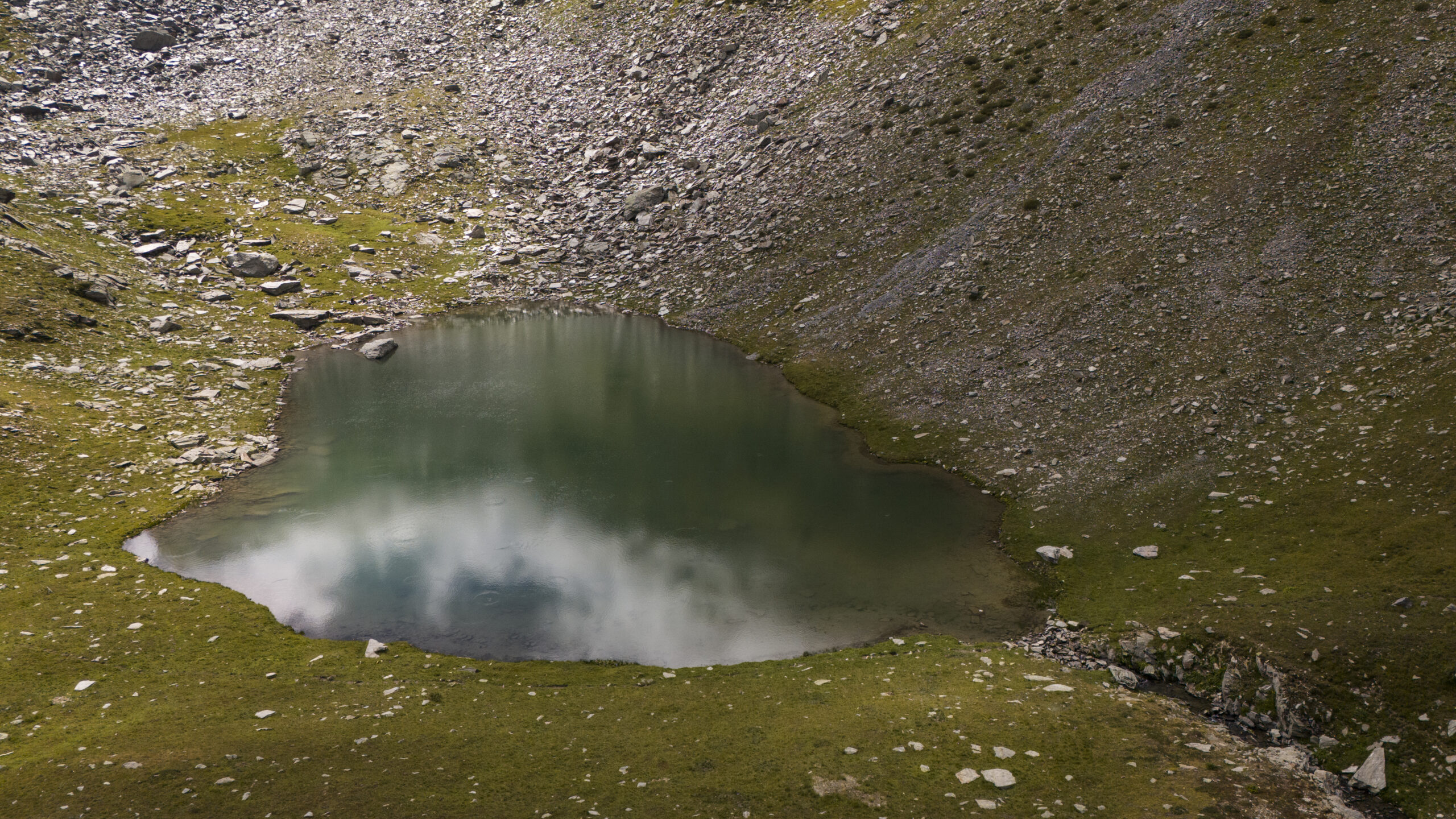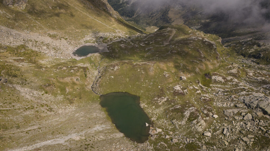 Dalla stazione di arrivo della seggiovia, posta sul tondeggiante rilievo del Bric Rond 2540 m, si volge a sinistra, tralasciando subito il tracciato E.P.T. 205 destinato, a sinistra, a scendere verso il Lago d’Envie. Continuando sulla destra, si supera una piccola costruzione, per procedere tagliano a mezzacosta il pendio erboso che precipita sulla Conca dei 13 Laghi, di cui si ha una bella visione. Affrontato un tratto attrezzato, in cui per effetto del crollo di una parte dell’antico tracciato bisogna scendere per attraversare una breve pietraia, si lascia a destra il bel Lago Ramella (o dei Cannoni), per riprendere il tracciato E.P.T. 205 proveniente dalla Conca (lo stesso, già incontrato, poi destinato a scendere verso il lago di Envie) con il quale, con un lungo traverso, si raggiunge il Passo Cialancia (o Porta Cialancia) 2683 m, che mette in comunicazione la Conca dei 13 Laghi con la Conca Cialancia, ove si possono vedere i 2 laghetti meta della gita. Di qui, volgendo a sinistra, si imbocca un evidente sentiero discendente (201) che, dopo alcune serpentine scende lungo una sorta di piano inclinato che taglia un pendio erboso, fino a raggiungere l’altipiano ove occhieggiano i 2 Laghi della Cialancia 2451 m (ore 2 dalla partenza)