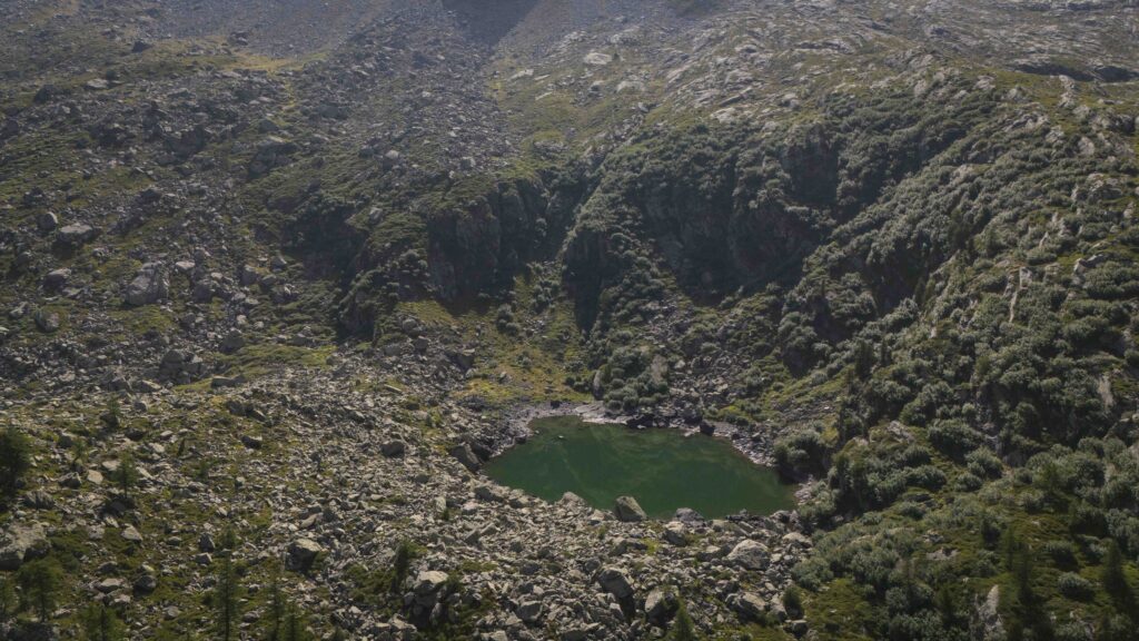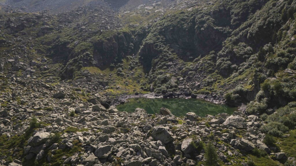 Per il ritorno, sarà opportuno tenere una strada leggermente diversa. Lasciato il rifugio ci si porta sul crinale erboso- roccioso della Schiena d’asino, tenendone il filo di cresta e seguendo gli abbondantissimi segnavia gialli della corsa “Tre Rifugi”. Giunti ai piedi del crestone si varca un corso d’acqua generalmente in secca, raggiungendo il curioso monumento in pietra, con un’enorme elica d’aereo cementata ai suoi piedi, che ricorda una sciagura aviatoria qui avvenuta nel 1957. Circa 10 metri prima del monumento, un’esilissima traccia sulla destra, porta allo splendido lago Malconsej 2125 m, posto in una zona di massi e cassere 15 minuti a monte del sentiero.