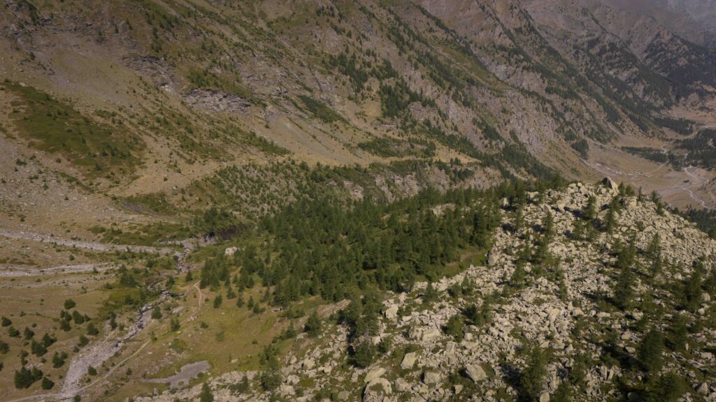 Continuando in leggera discesa, di qui, si entra nella “via dei Larici”, segnalata in precedenza, che, tra rade resinose e fitti cespugli di mirtillo e lampone serpeggia a valle fino a raggiungere in breve la Conca del Prà. Per un recente ponte in legna, a questo punto, si attraversa il Pellice per toccare l’alpeggio di Partia d’amont. Dal Prà, seguendo la carrozzabile a fondo naturale, si scende facilmente a Villanova (ore 5.15 l’intero anello).