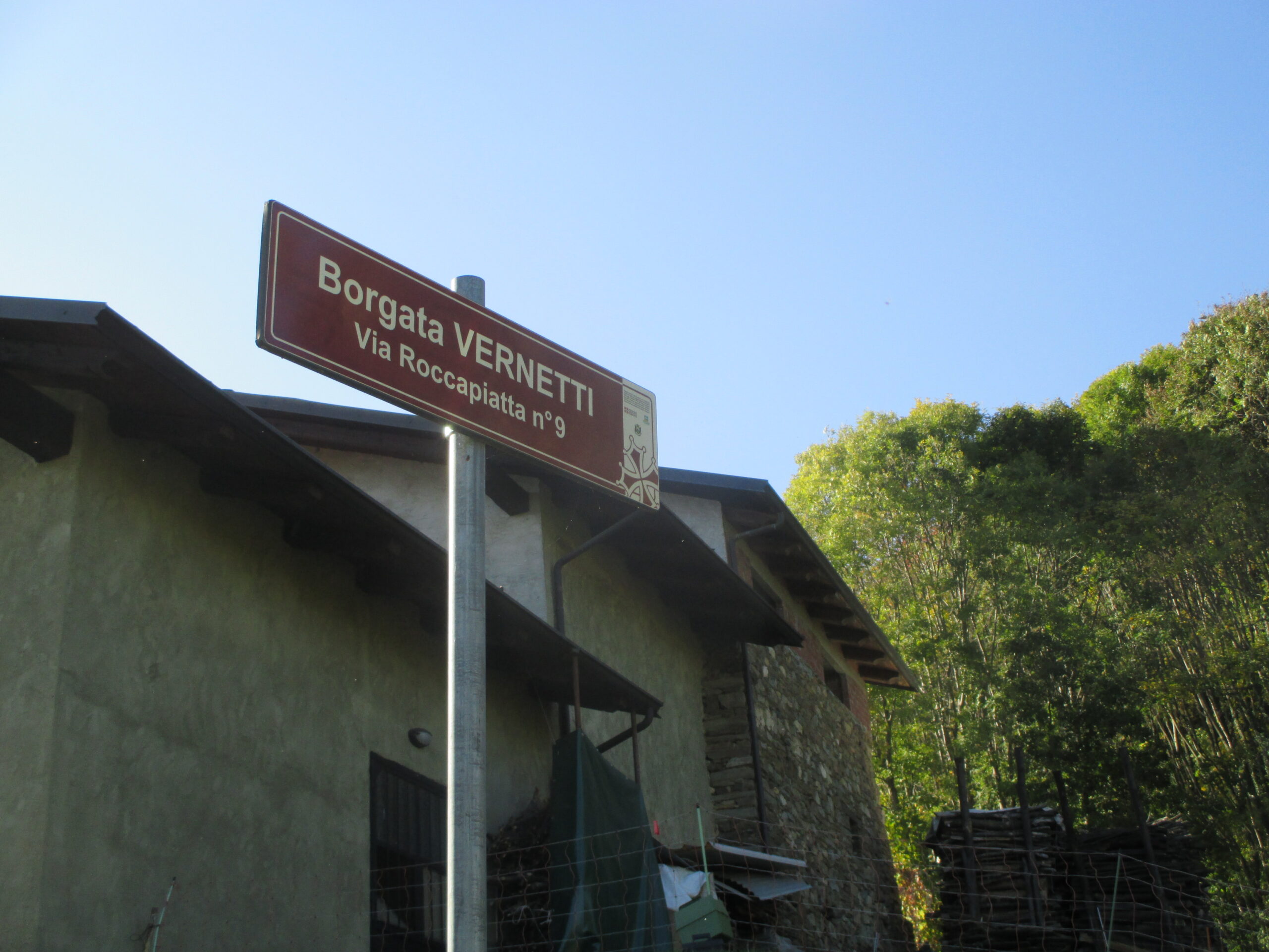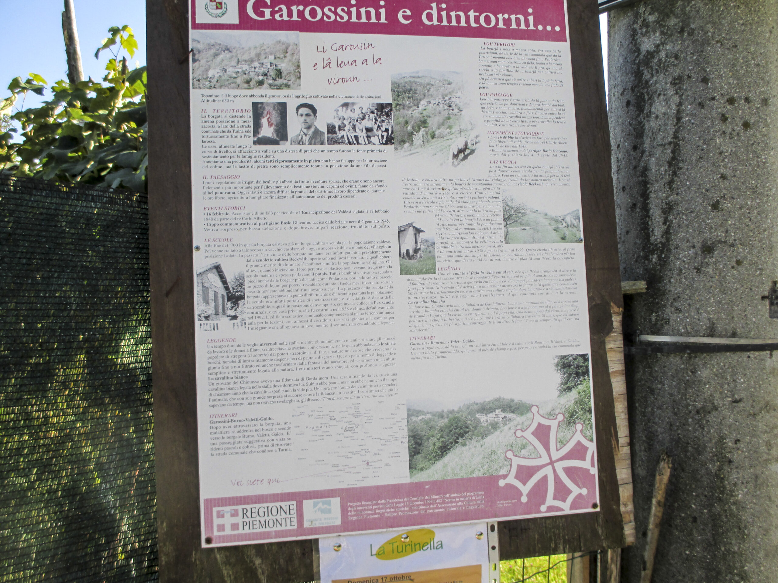 Passiamo alla borgata Roncaglia (foto 8), quindi arriviamo alla borgata Castellazzo, (foto 9) che si trova all’inizio di un breve pianoro (foto 10), al termine del quale troviamo sulla destra una edificio in ristrutturazione che ci dice essere stato una scuola elementare (foto 11), quando negli anni passati la montagna era ancora maggiormente popolata; sulla sinistra, poi, troviamo la borgata Garossini (foto 12 e 13), ove è presente un pannello che descrive brevemente la storia della località.