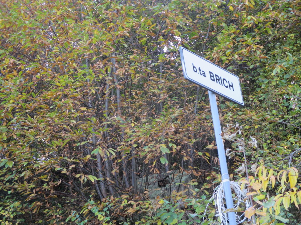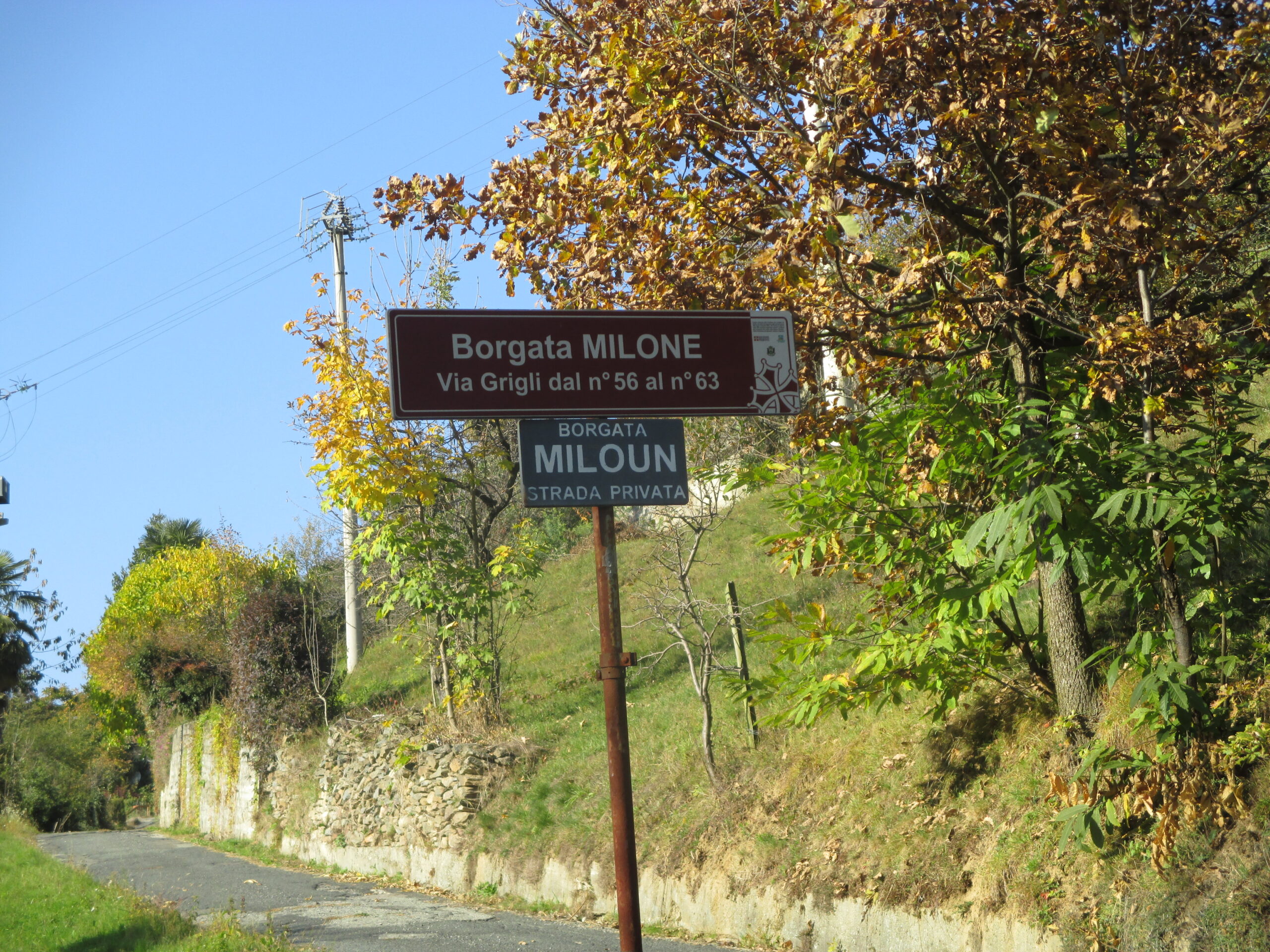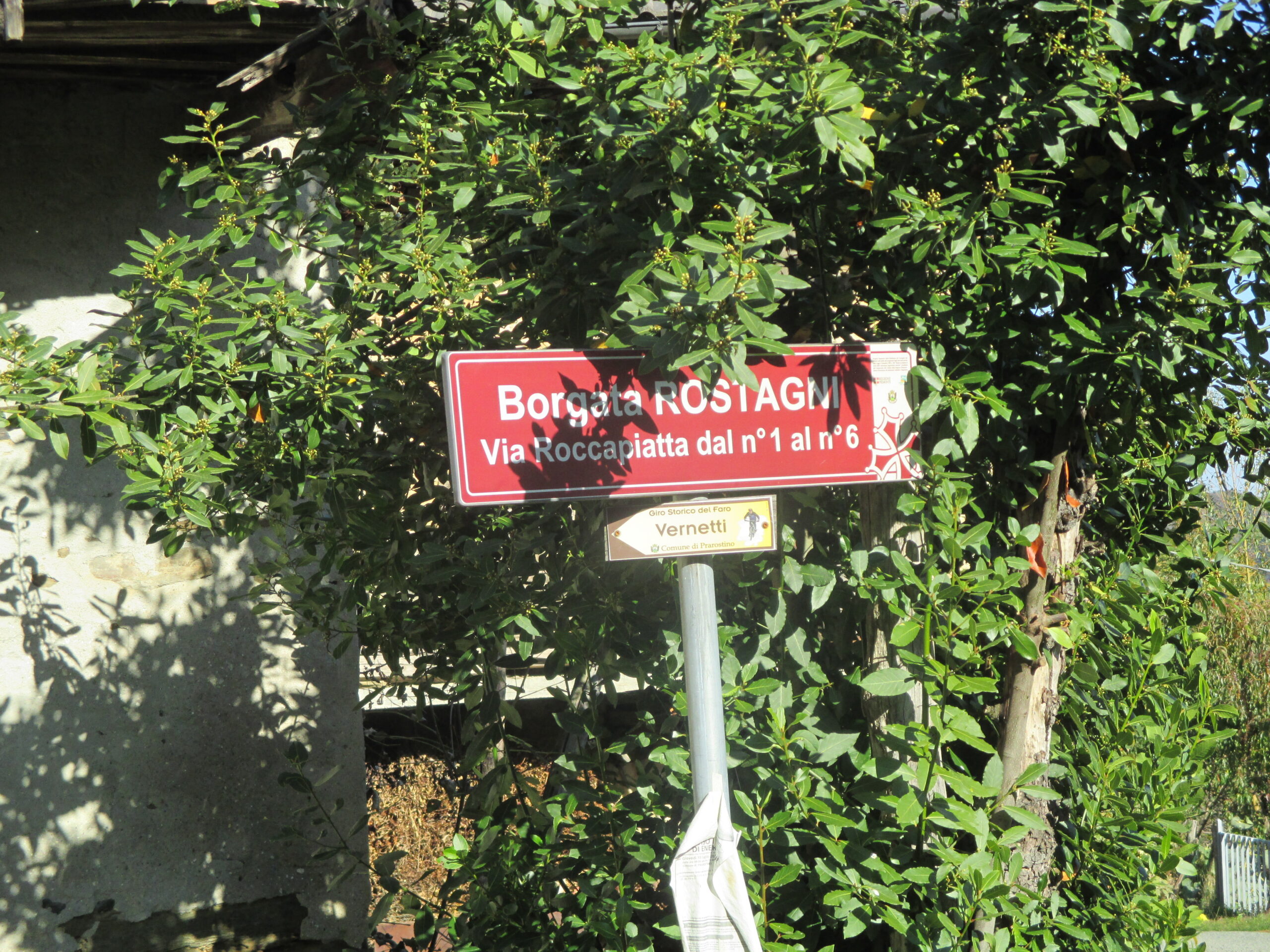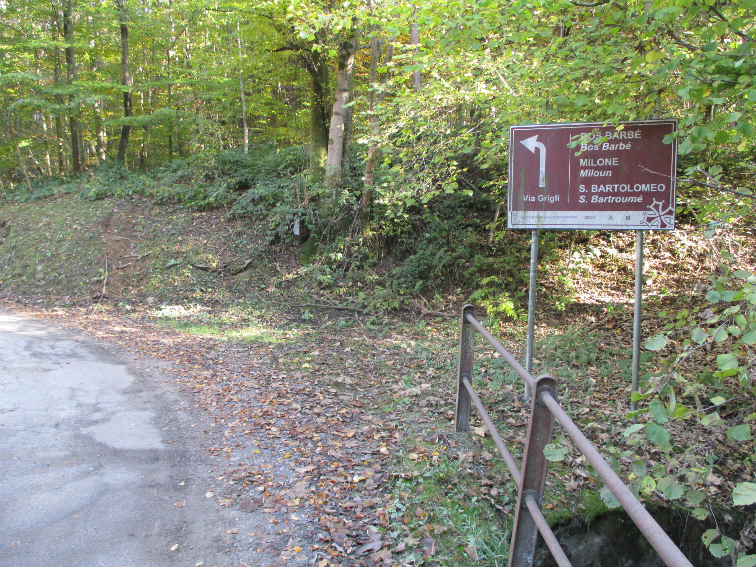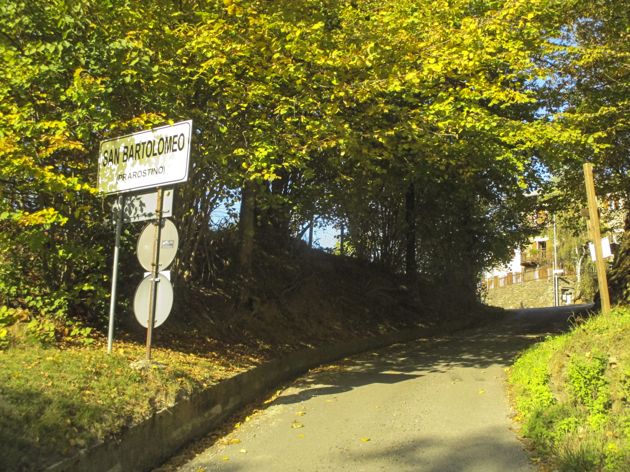 L’on parcourt à l’arrière la route en revenant à la bourgade Rostagni où l’on avait effectué la déviation en reprenant la descente. Au cours de cette dernière l’on trouve encore les bourgades Chiarvetto et Campaccio (photo 36) et, en arrivant au carrefour avec la route qui descend de San Bartolomeo (photo 37), l’on tourne à droite et, après quelques mètres, l’on traverse un petit pont avec un autre panneau (photo 38) qui indique clairement la direction à suivre. Puis l’on recommence à monter, en passant par la bourgade Milone ou Miloun (photo 39), et après deux km voilà que l’on arrive au chef lieu de Prarostino – San Bartolomeo – (photo 40) ou, comme indiqué par le panneau de la photo 38 « San Bartroumè ».