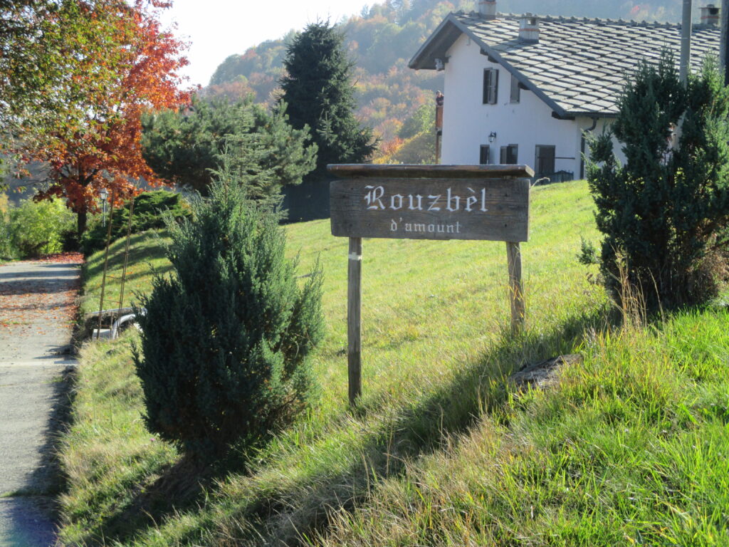 L’on arrive à la bourgade de Rosbello (photo 21) ou, comme indiqué par un panneau plus artisanal, Rouzbèl d’amount (photos 22 et 23) et, par un autre effort, l’on arrive, juste après un peu plus de 4 km du ponte Palestro, à la belle cuvette herbeuse de Pralarossa (photos 24 et 25) d’où l’on peut aussi voir à distance la prochaine destination de notre tour (photo 26) : San Bartolomeo di Prarostino.