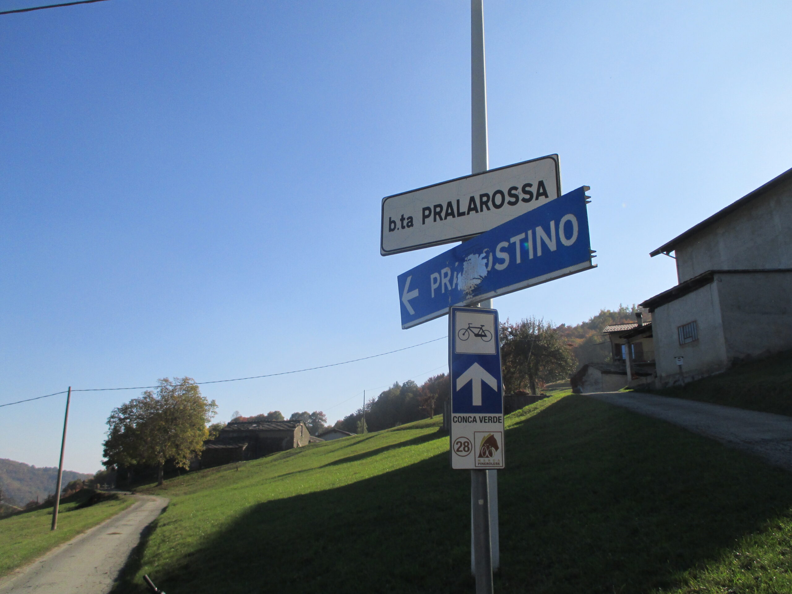 Raggiungiamo la borgata Rosbello (foto 21) o, come ci dice un cartello più artigianale Rouzbèl d’amount (foto 22 e 23) e con un altro sforzo raggiungiamo, dopo poco più di 4 km dal ponte Palestro, la bella conca erbosa di Pralarossa (foto 24 e 25), da cui possiamo anche vedere in lontananza la prossima meta del nostro giro (foto 26): San Bartolomeo di Prarostino.