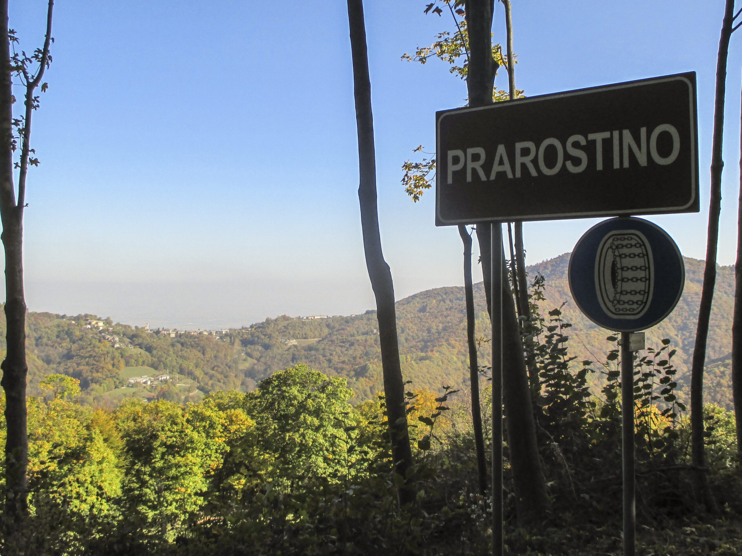Dopo alcune decine di metri, prima di arrivare sulla piazza, svoltiamo a destra seguendo la direzione Angrogna – Bricherasio – Via Piani (foto 41) e con alcune centinaia di metri arriviamo ad una piccola rotonda dove continuiamo a seguire la direzione Bricherasio – Angrogna (foto 42). Tutto ciò non prima di esserci soffermati un momento ad osservare il monumento in ricordo della guerra partigiana cioè il “Faro di Prarostino“, nonché lo splendido panorama che si apre alla sua destra (foto 43). Ci troviamo ora ad affrontare una breve ma ripida salita a cui segue un breve pianoro che ci porta ad un bivio dove le strade si dividono (foto 44); seguiamo a sinistra la direzione Bricherasio che ci porta in un paio di km a trovare una deviazione sulla sinistra con un ben visibile cartello che indica direzione Bricherasio (foto 45) e ci conduce, con una bella discesa, verso il fondo valle.