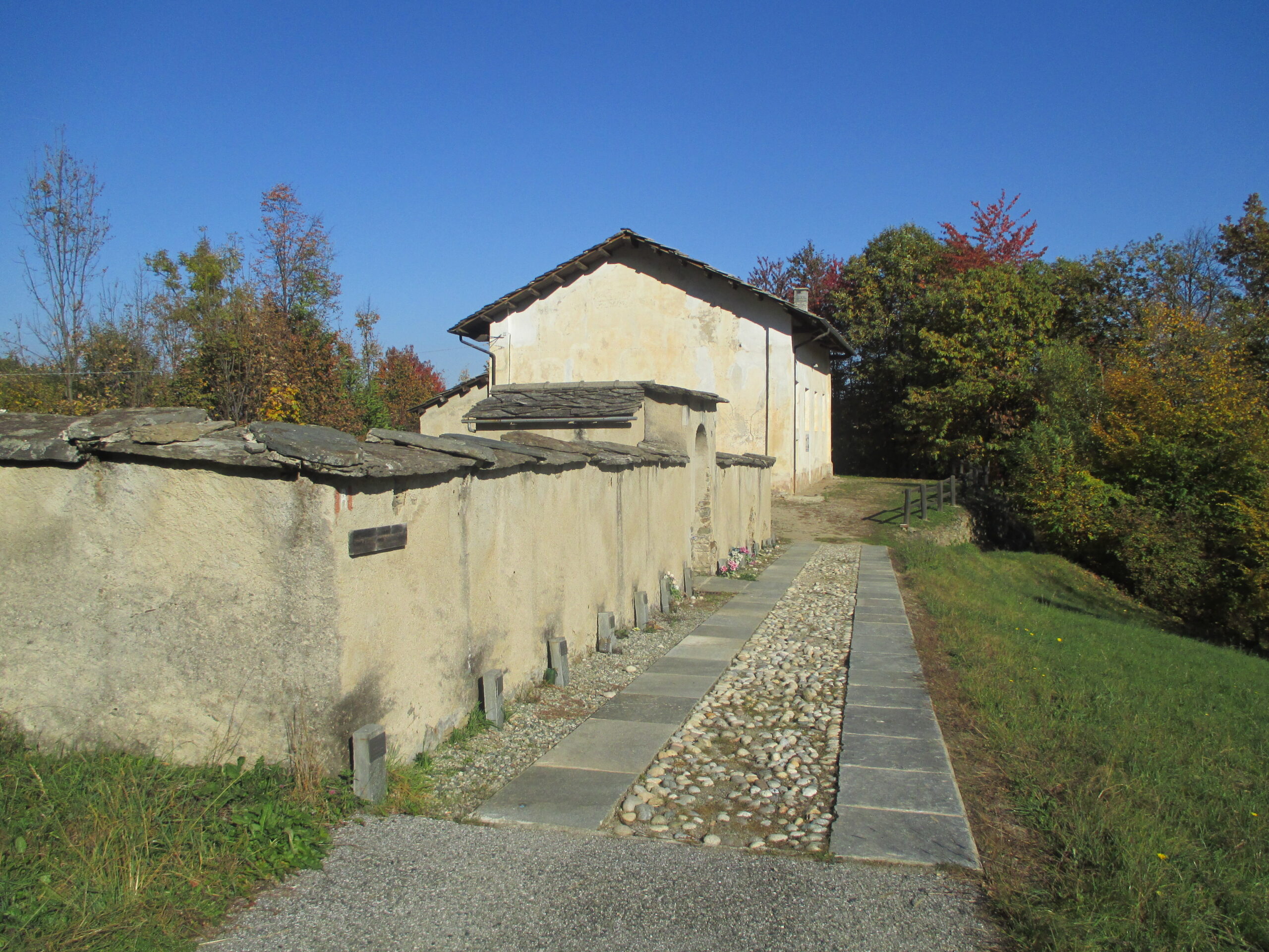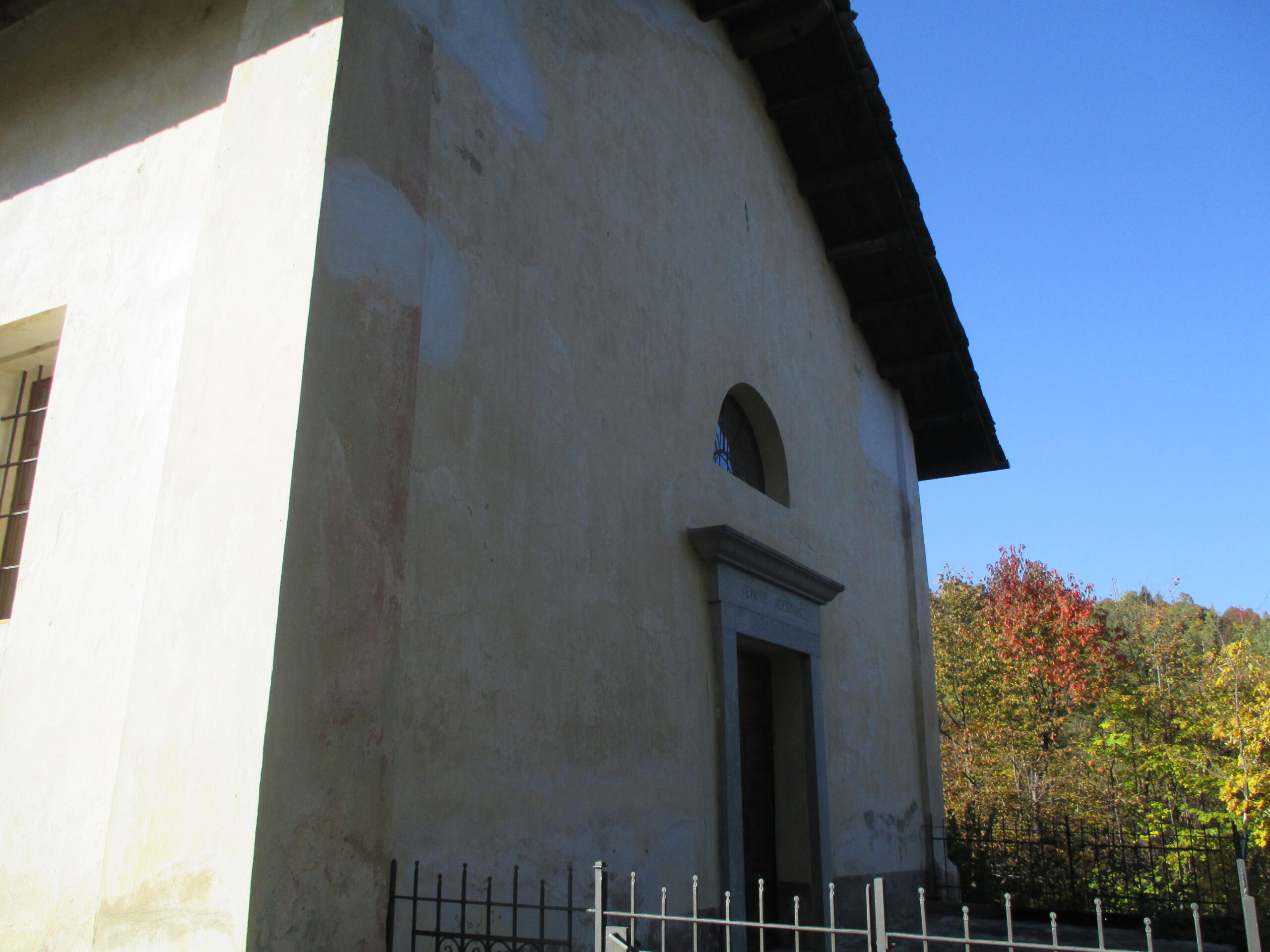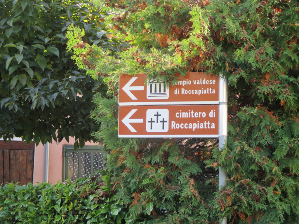 L’on prend maintenant en direction de Prarostino et l’on commence à descendre, en trouvant à un certain point, le panneau qui confirme l’entrée dans la commune de Prarostino (photo 27). Pourtant, dans la même photo l’on peut voir que San Bartolomeo se trouve encore dans l’autre côté de la vallée et donc l’on doit continuer la descente ; l’on passe par les bourgades Vernetti (photo 28), Losera (photo 29), Romani di Rocca Piatta (photo 30) et puis l’on arrive à la bourgade Rostagni (photo 31), où l’on trouve une déviation à la droite avec des indications « Tempio Valdese et Cimitero di Roccapiatta » (photo 32). Du moment qu’il s’agit d’un des temples vaudois les plus anciens des vallées, une visite s’impose ; donc avec une déviation à droite de quelques centaines de mètres l’on arrive au temple en question avec son cimetière à côté (photos 33 et 34). Sur la parois latérale du Temple l’on trouve un panneau (photo 35) qui en décrit l’histoire, commencée même avec la première construction dans ce site en 1592, suivie par de nombreuses destructions durant les guerres de religion et les reconstructions successives.