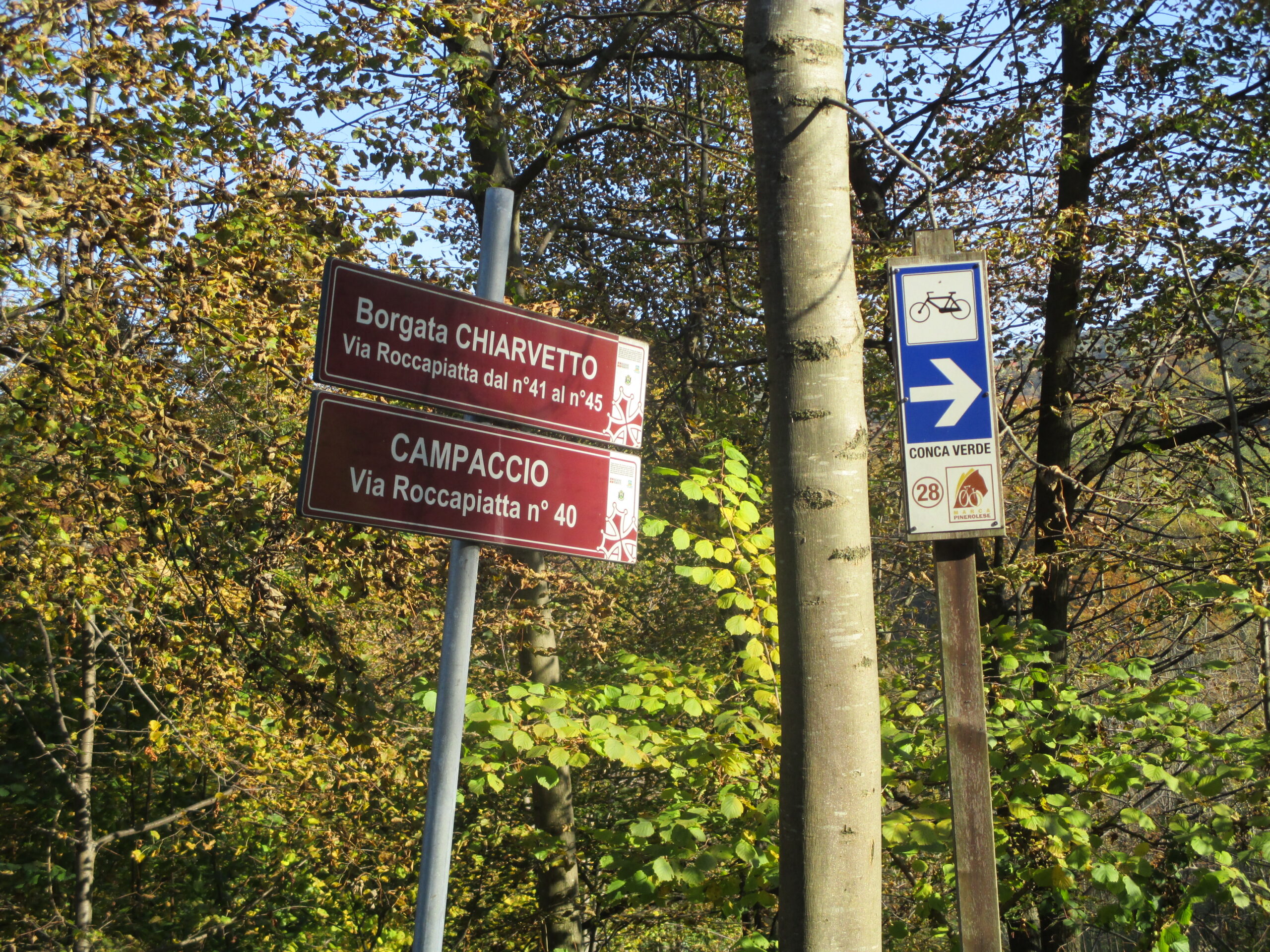 Dopo circa 4 km di discesa troviamo, su un piccolo pianoro alla nostra destra, la chiesetta di Santa Caterina (foto 46), sul cui piccolo sagrato possiamo ammirare un pregevole tavolo in pietra il cui piano superiore è costituito da un’unica pietra lavorata su cui sono indicati i quattro punti cardinali (foto 47). Proseguendo la discesa giungiamo in località San Michele di Bricherasio (foto 48); qui svoltiamo a sinistra e passiamo davanti alla relativa chiesa (foto 49), proseguendo poi sulla strada principale in direzione di Bricherasio fino ad arrivare all’incrocio sulla destra con via Torretti (foto 50), dove svoltiamo in direzione La Rivà.