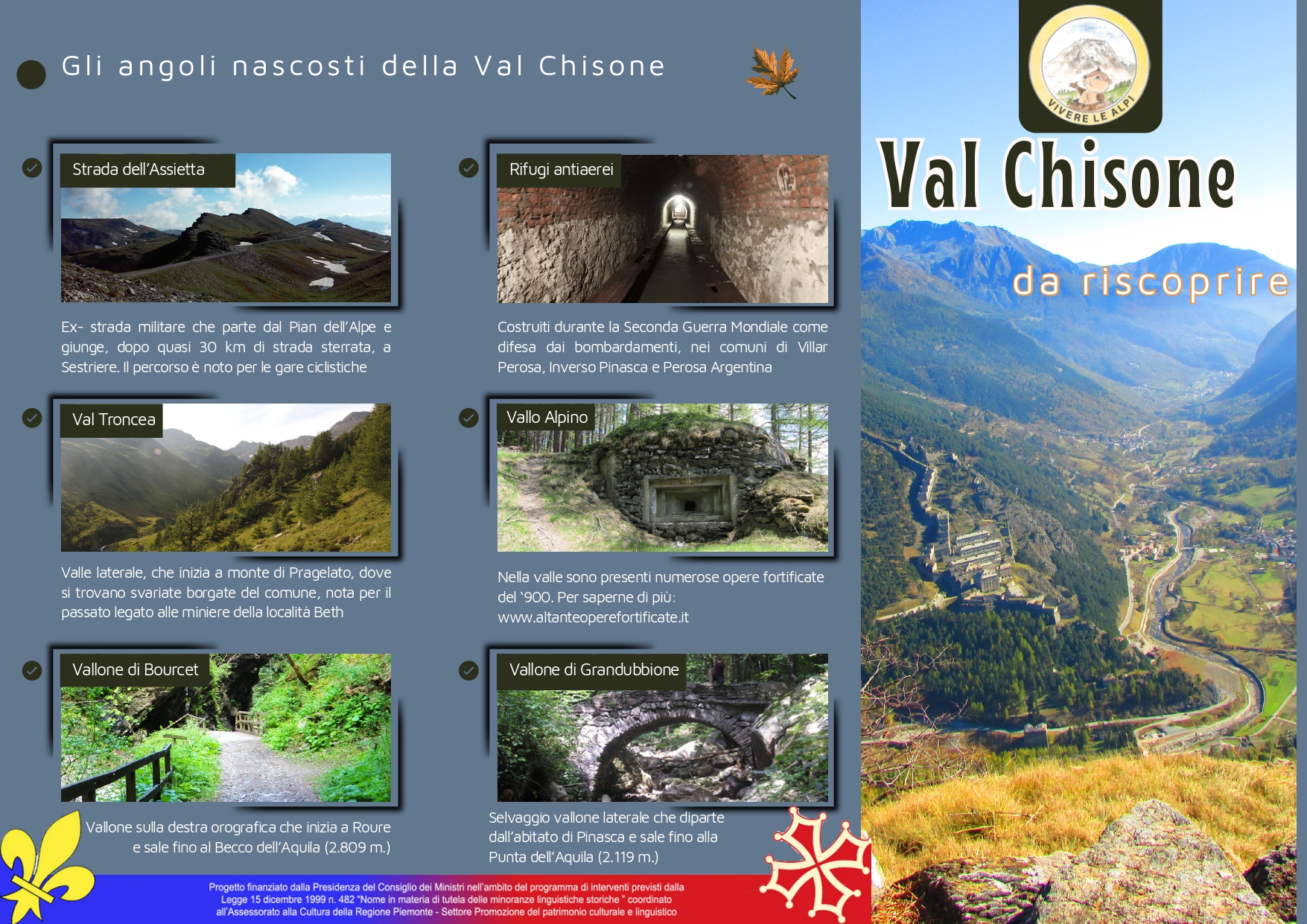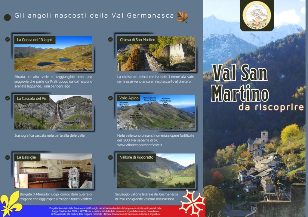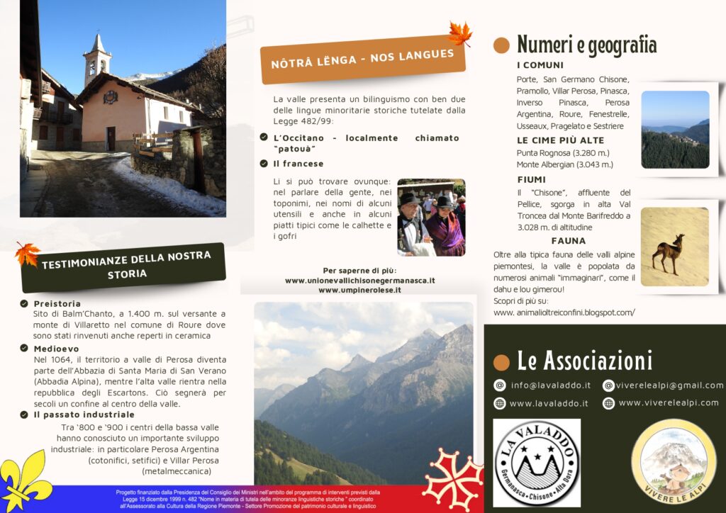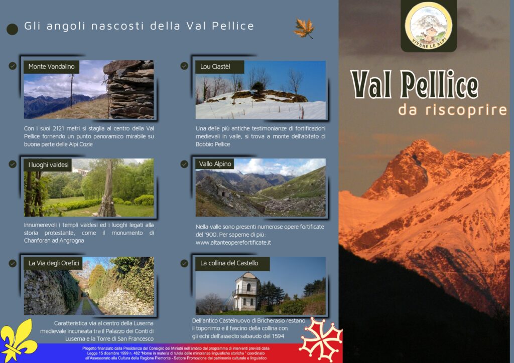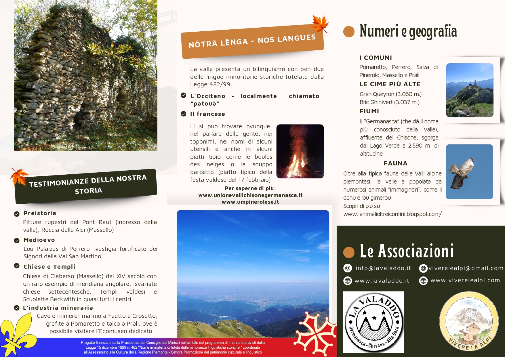 Grazie ai finanziamenti erogati ai sensi della Legge 15 dicembre 1999, n. 482, rubricata “Norme in materia di tutela delle minoranze linguistiche storiche” che ha dato attuazione all’articolo 6 della Costituzione, le Associazioni Vivere le Alpi e La Valaddo hanno promosso la realizzazione di volantini pieghevoli informativi sulle risorse culturali e linguistiche delle valli pinerolesi. Numerosi esemplari sono già stati distribuiti agli Istituti Comprensivi e agli uffici turistici del territorio; chi ne volesse può far richiesta all’indirizzo viverelealpi@gmail.com sino ad esaurimento degli stessi!
