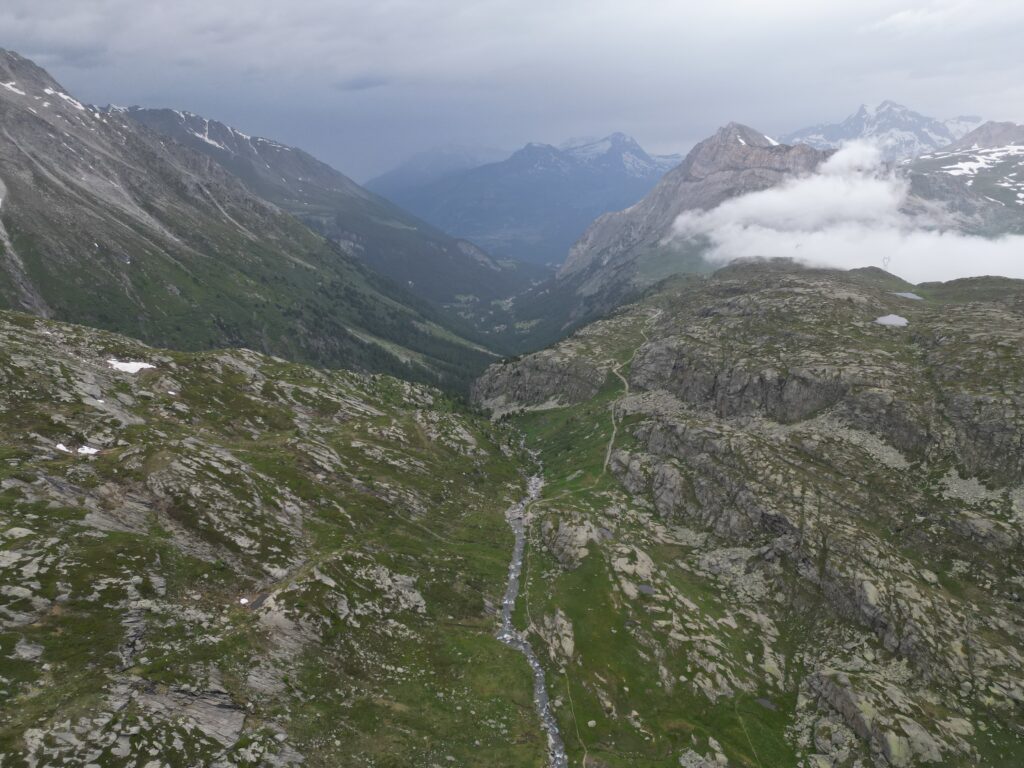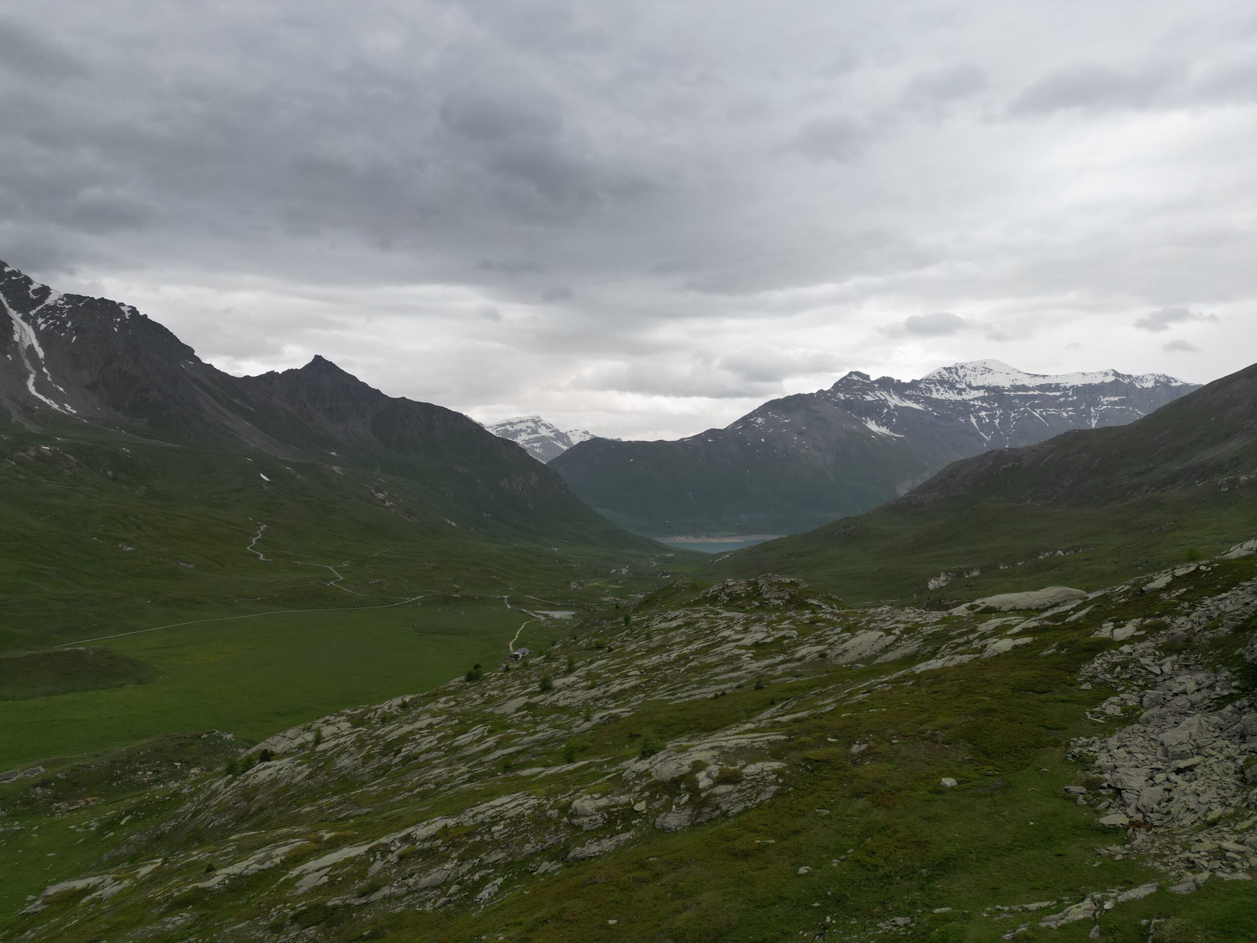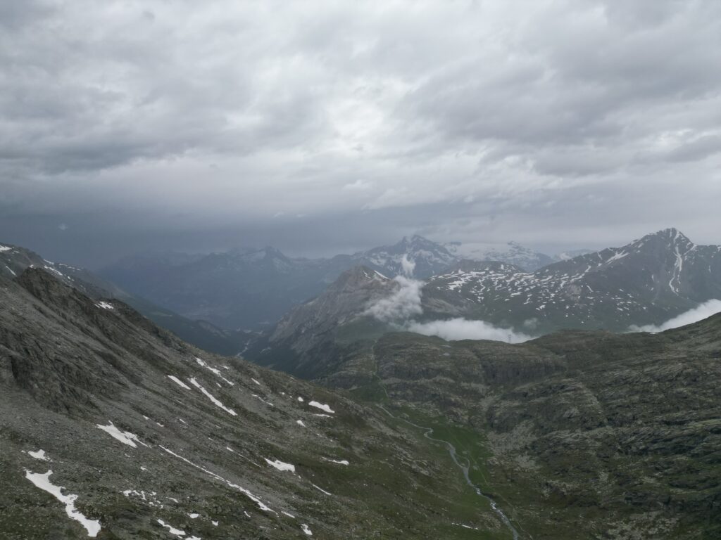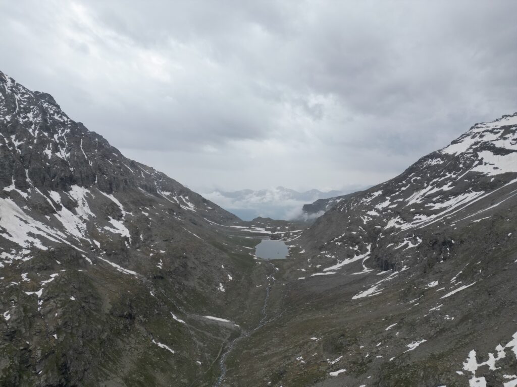 Serpeggiando lungo il dirupato versante meridionale del Signal du Grand Mont Cenis, il traccaito acquista rapidamente quota e permettendo a chi lo percorre di godere della visione del lago sottostante e degli appicchi scoscesi che caratterizzano vicina parete sud-occidentale della P.te de la Ronce. Attraversa un terzo pianoro erboso. Superato il pianoro il sentiero abbandona i pascoli per piegare a sinistra ed attraversare pendii di sfasciumi. Qui, in realtà, il tracciato (raramente percorso) tende un po’ a perdersi, ma segnavia gialli ben evidenti indicano il percorso. In ogni caso le difficoltà offerte dal terreno non si rivelano certo insormontabili. Con una lunga traversata a destra il sentiero si porta proprio al di sotto dell’ormai vicino Col du Lou,3042 m, risalendo poi ripidamente l’ultimo pendio di sfasciumi che mette al valico, piuttosto stretto e desolato, da cui però si può godere di una bella visuale sui ghiacciai della Vanoise.