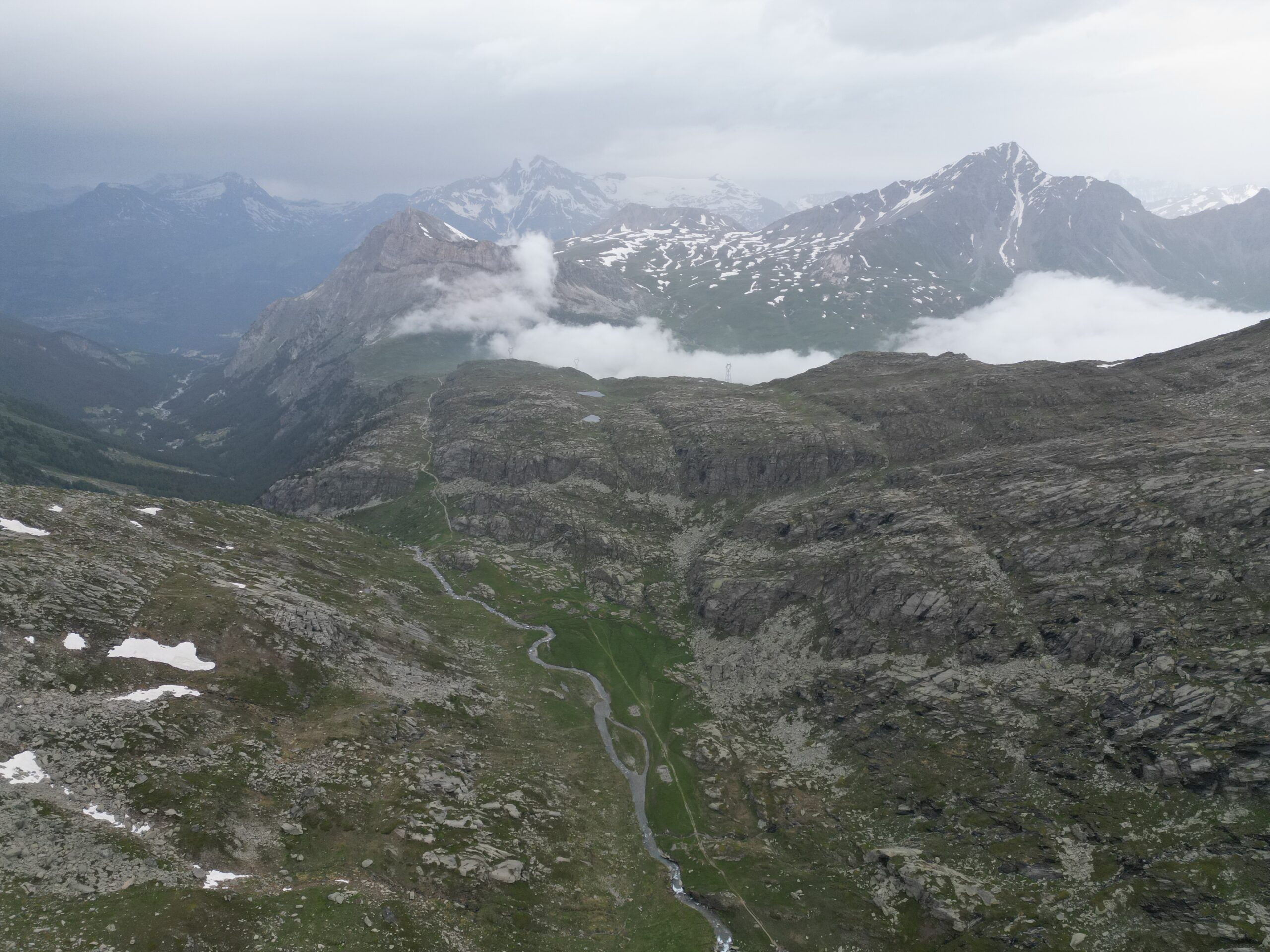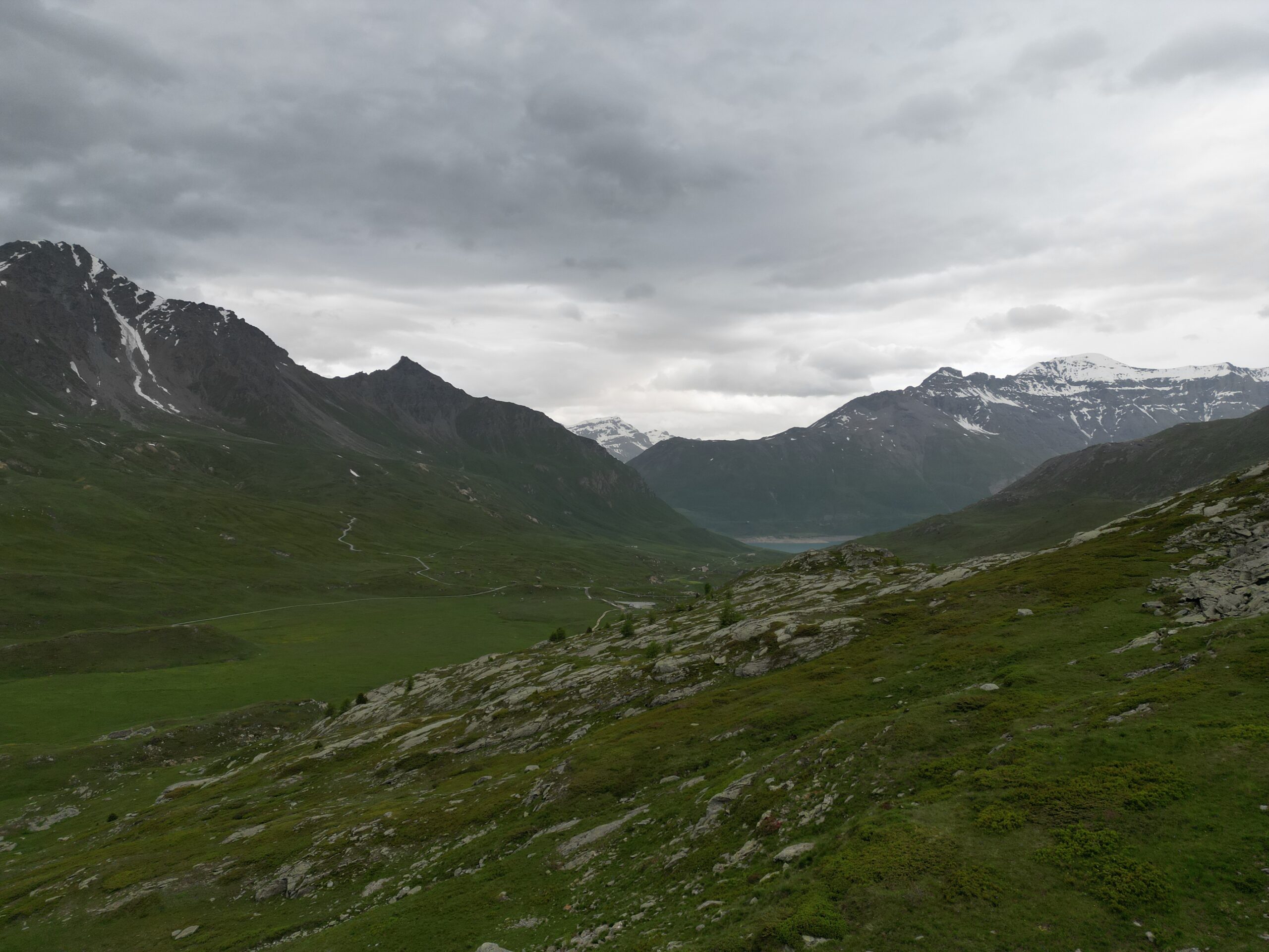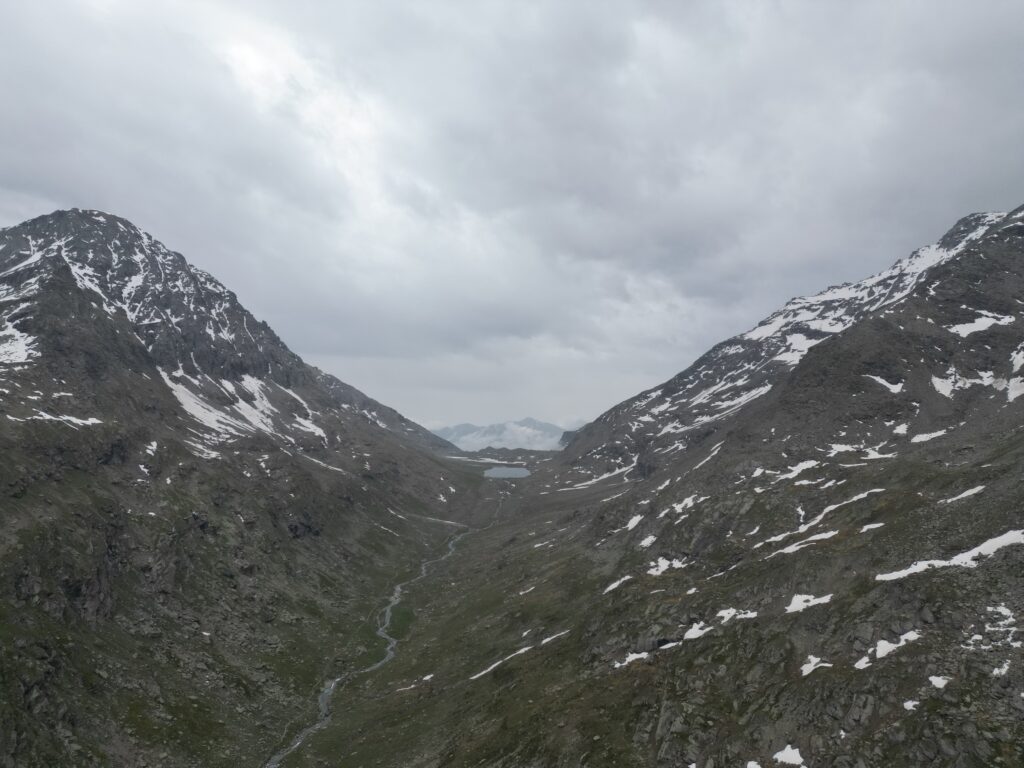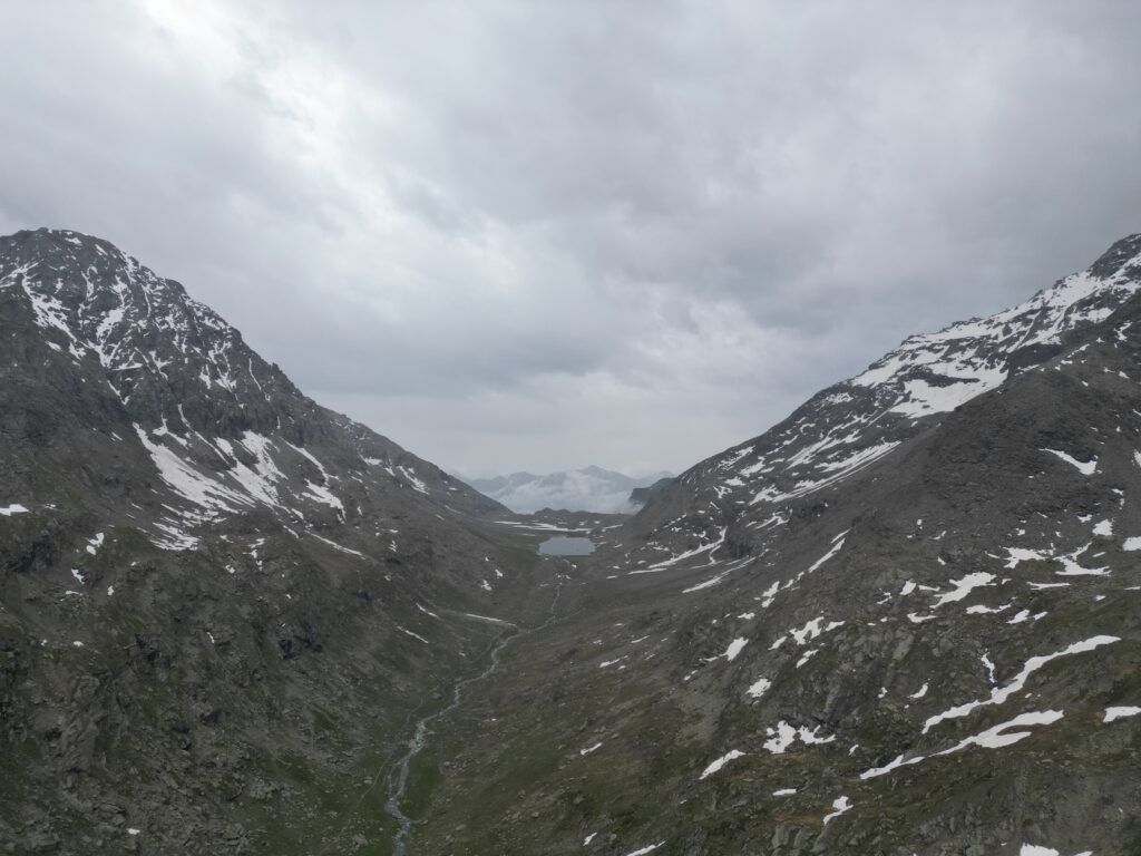 Serpeggiando lungo il dirupato versante meridionale del Signal du Grand Mont Cenis, il traccaito acquista rapidamente quota e permettendo a chi lo percorre di godere della visione del lago sottostante e degli appicchi scoscesi che caratterizzano vicina parete sud-occidentale della P.te de la Ronce. Attraversa un terzo pianoro erboso. Superato il pianoro il sentiero abbandona i pascoli per piegare a sinistra ed attraversare pendii di sfasciumi. Qui, in realtà, il tracciato (raramente percorso) tende un po’ a perdersi, ma segnavia gialli ben evidenti indicano il percorso. In ogni caso le difficoltà offerte dal terreno non si rivelano certo insormontabili. Con una lunga traversata a destra il sentiero si porta proprio al di sotto dell’ormai vicino Col du Lou,3042 m, risalendo poi ripidamente l’ultimo pendio di sfasciumi che mette al valico, piuttosto stretto e desolato, da cui però si può godere di una bella visuale sui ghiacciai della Vanoise.