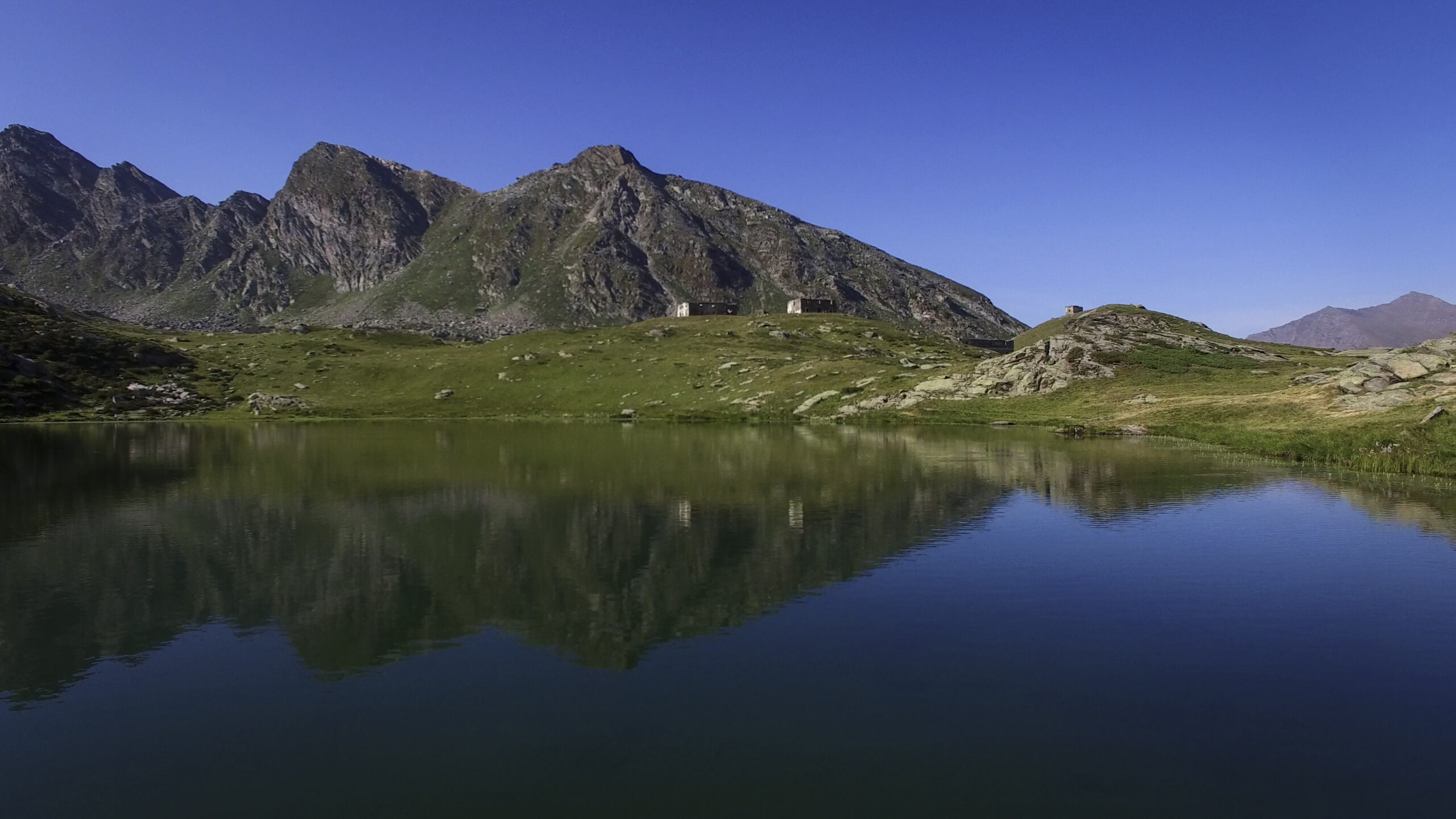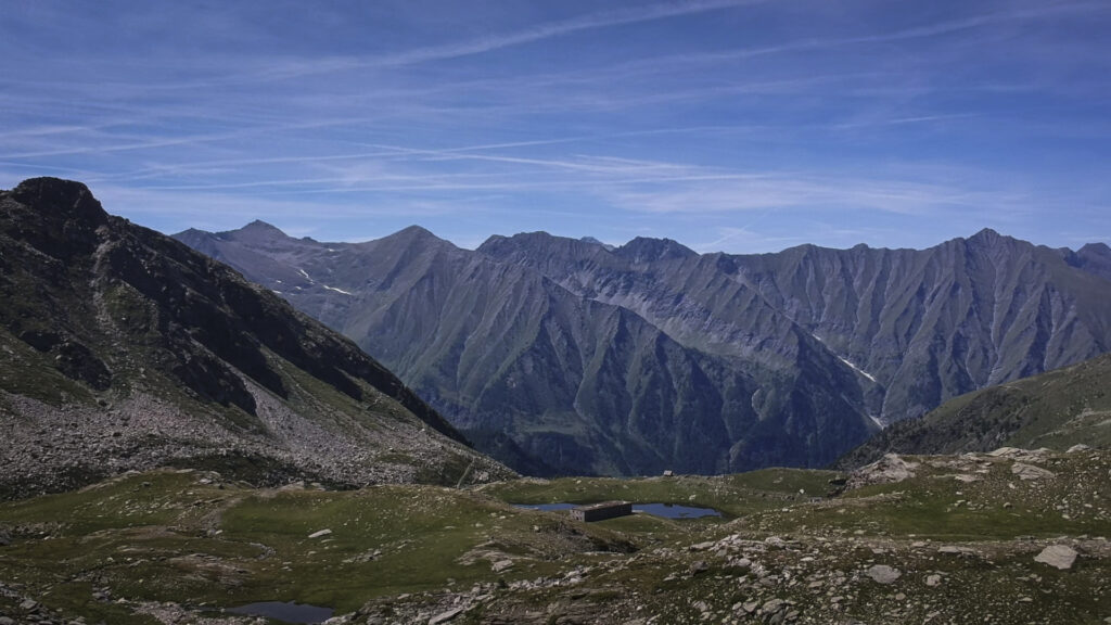 Lasciato il Passo, si continua su sentiero lastricato (E.P.T. 201), che dopo 2 tornantini taglia a mezzacosta pochi metri sotto la vetta di P.ta Cialancia 2855 m (raggiungibile per breve digressione in 5 min.), tenendo prevalentemente il versante di Conca Cialancia ove spiccano i due azzurri Laghi della Cialancia si taglia tutto il versante est del rilievo, divallando poi ripidamente ancora sul versante di Conca Cialancia e raggiungendo con breve deviazione a sin. l’ampia sella erbosa del Passo (o Porta) Cialancia 2683 m (ore 3 dal Bric Rond).