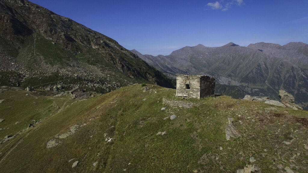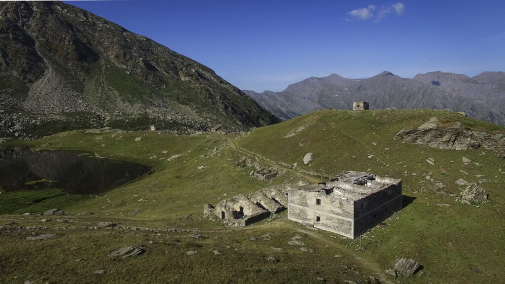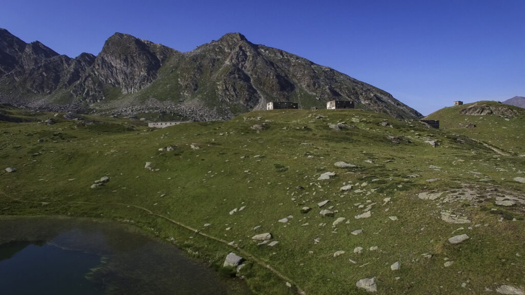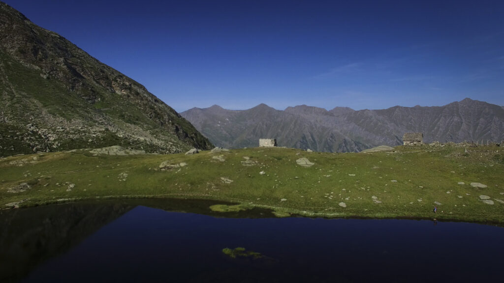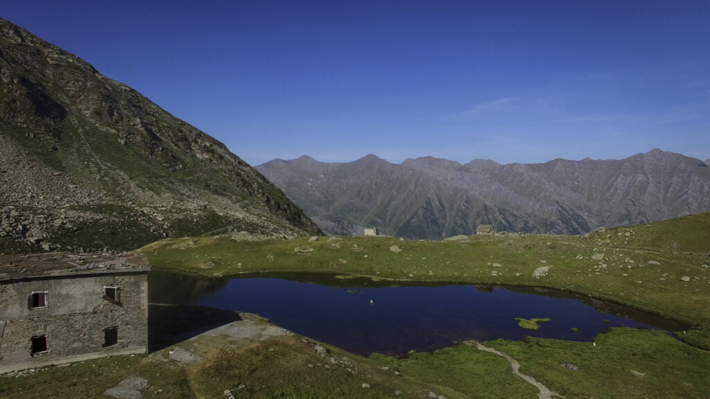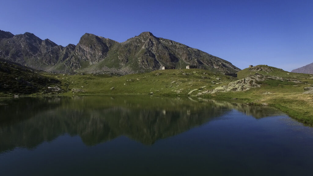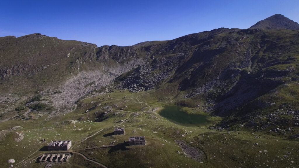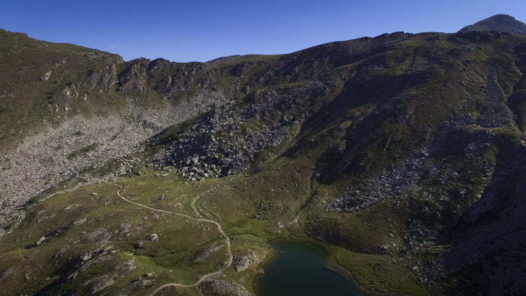 Di qui, tornando sul versante dei 13 Laghi, si scende con buon sentiero (nuovamente E.P.T. 205) al vicino e ben visibile Lago Ramella (o dei Cannoni) 2586 m, che va contornato sulla sponda meridionale per poi risalire brevemente – lasciando a sinistra il sentiero (E.P.T. 205) che riporta nella Conca dei 13 Laghi – e portarsi per una zona di cassere, sul crinale spartiacque fra la Conca dei 13 Laghi e quella ove occhieggia il Lago d’Envie 2314 m, il più grande della val Germanasca. Seguendo il filo di cresta il sentiero scende ad un avvallamento erboso, per poi tagliare a mezzacosta e raggiungere il cocuzzolo del Bric Rond 2546 m, ove si incontra la stazione d’arrivo della seggiovia (ore 3.30 complessive)