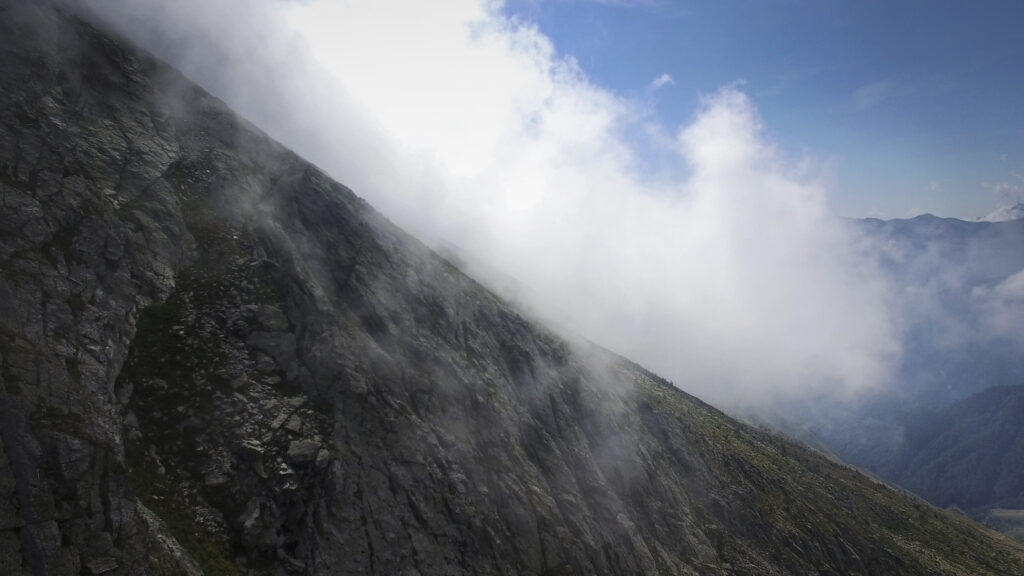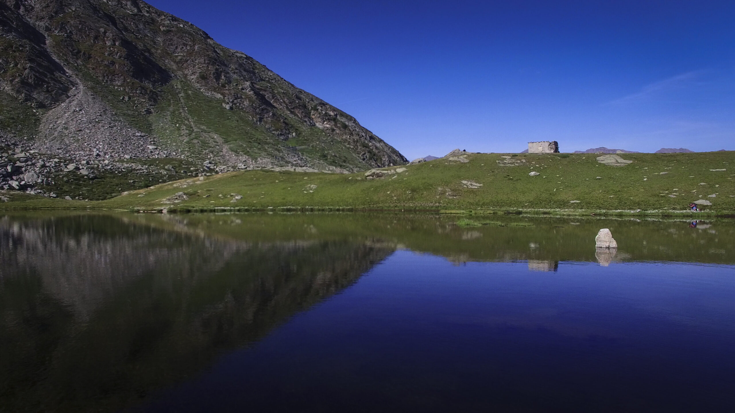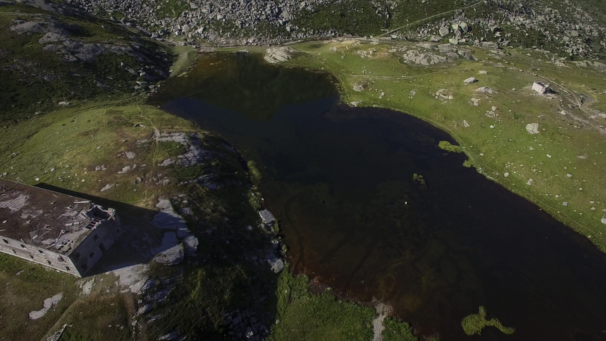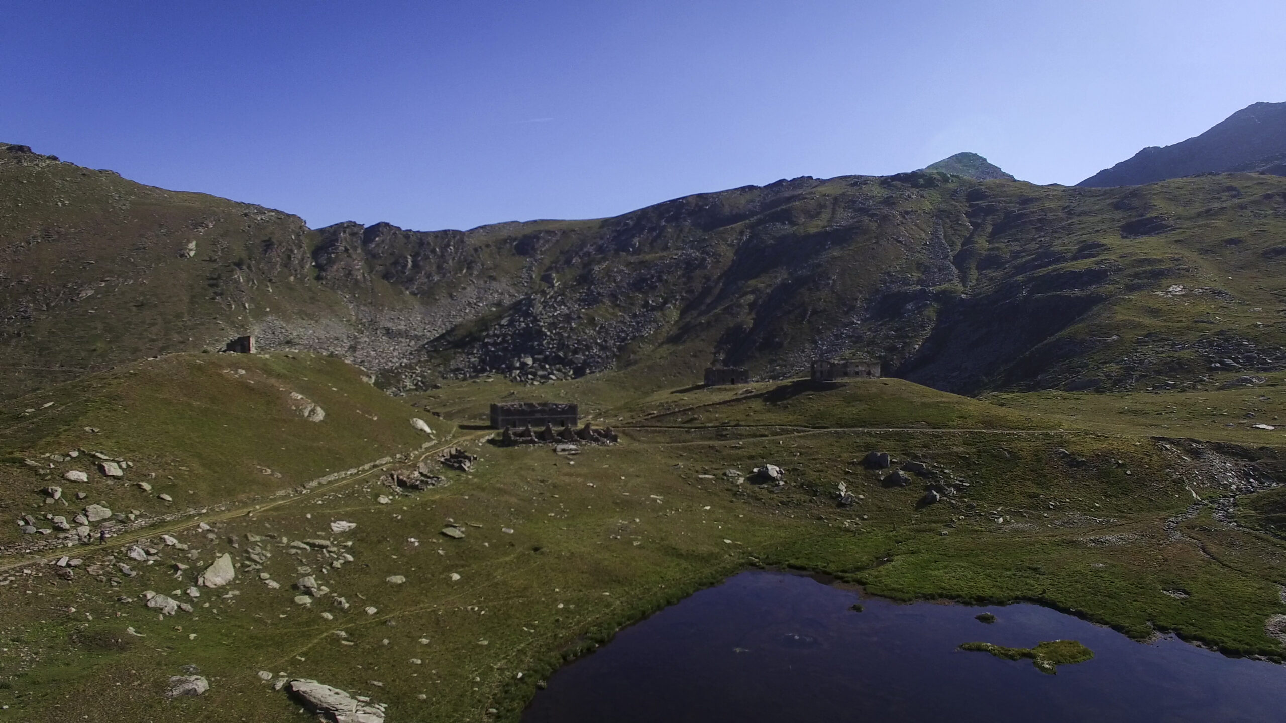 Di qui, tornando sul versante dei 13 Laghi, si scende con buon sentiero (nuovamente E.P.T. 205) al vicino e ben visibile Lago Ramella (o dei Cannoni) 2586 m, che va contornato sulla sponda meridionale per poi risalire brevemente – lasciando a sinistra il sentiero (E.P.T. 205) che riporta nella Conca dei 13 Laghi – e portarsi per una zona di cassere, sul crinale spartiacque fra la Conca dei 13 Laghi e quella ove occhieggia il Lago d’Envie 2314 m, il più grande della val Germanasca. Seguendo il filo di cresta il sentiero scende ad un avvallamento erboso, per poi tagliare a mezzacosta e raggiungere il cocuzzolo del Bric Rond 2546 m, ove si incontra la stazione d’arrivo della seggiovia (ore 3.30 complessive)